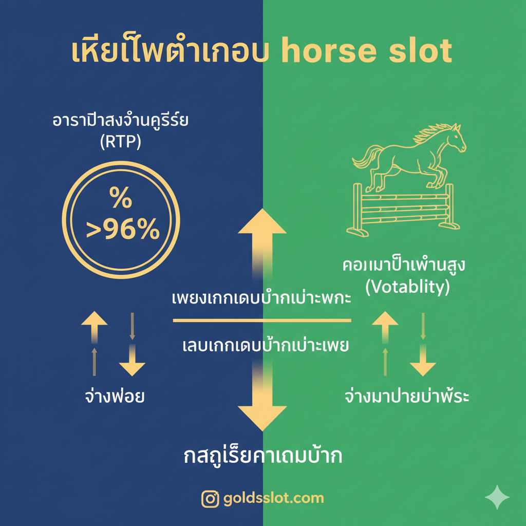 96%) อีกด้านหนึ่งเป็นรูปม้ากำลังกระโดดข้ามรั้ว (เพื่อสื่อถึงความผันผวนสูง) มีลูกศรชี้ขึ้นและลงพร้อมคำว่า 'Bet' เพื่ออธิบายกลยุทธ์การเพิ่ม/ลดการเดิมพัน ภาพโดยรวมใช้สีเขียว/น้ำเงินเพื่อให้ดูเป็นข้อมูลที่น่าเชื่อถือและเข้าใจง่าย สไตล์ภาพเป็นแบบ infographic ผสมผสานกับองค์ประกอบของเกมม้า”>